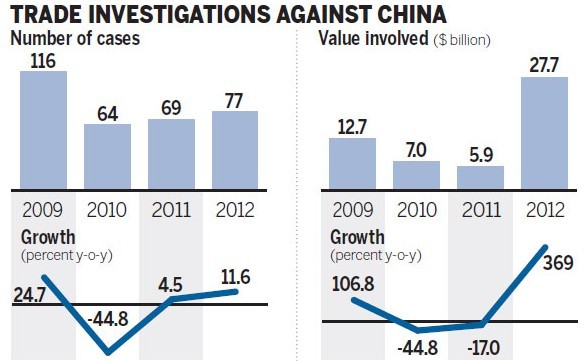 In 2012, 21 countries launched 77 trade remedy investigations against China with the total amount involved at about $27.7 billion. This was an increase of 11.6 percent year-on-year in the number of investigations and an increase of 369 percent in value compared with 2011, according to the Ministry of Commerce.