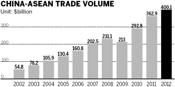 From $55 billion in 2002, bilateral trade between China and ASEAN increased to $400 billion in 2012. Over the past decade Sino-ASEAN trade has jumped more than 600 percent.