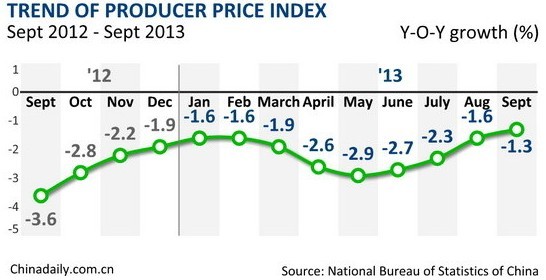 China's producer price index (PPI) fell 1.3 percent in September from a year earlier, compared with a 1.6-percent drop in August, the National Bureau of Statistics (NBS) said Monday.