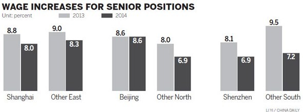 As for regional differences, Beijing and Shanghai have the highest wages, while southern regions have the lowest wage levels, the same as in previous years. Salaries in first-tier cities, on average, are 40 percent higher compared with those in second- or third-tier cities, according to the survey.
