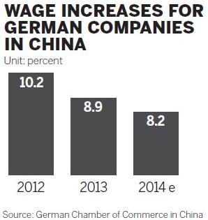 Annual wage increases in German companies operating in China are likely to decrease in 2014 due to the slower economic growth, as rising labor costs remain the major human resources issue, a report from the German Chamber of Commerce in China has said.