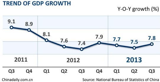 China's gross domestic product growth accelerated to 7.8 percent in the third quarter, up from 7.5 percent in the second quarter, the National Bureau of Statistics announced on Friday.