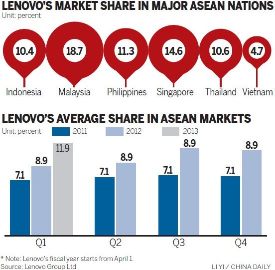 Lenovo's market share in ASEAN reached a record high of 11.9 percent during the first quarter of the new fiscal year, which started in April. Its market share was 8.9 percent a year earlier.