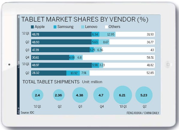 In 2010 and 2011, Apple had more than half of China's tablet computer market, but its share contracted because of stronger challenges.