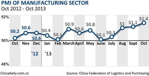 China's purchasing managers' index (PMI) for the manufacturing sector rose to 51.4 percent in October, hitting a new high since May 2012, according to new data released Friday.
