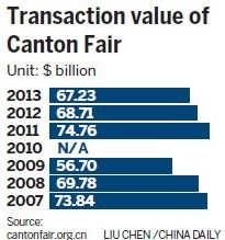 The China Import and Export Fair, widely known as the Canton Fair, saw the value of transactions drop 10.9 percent from the previous event to 194.6 billion yuan ($31.7 billion) because of lower global market demand, industrial competition and trade friction, said Liu Jianjun, spokesman for the fair.