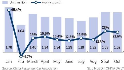 The country delivered 1,516,051 cars, sport-utility vehicles, multi-purpose vehicles and minivans in October, a surge of 21.6 percent over last year, according to the China Passenger Car Association released on Thursday.