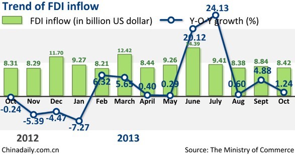 The ministry data showed FDI from the European Union surged 22.26 percent from a year earlier to 6.4 billion U.S. dollars in the first ten months, while investment from the United States climbed 12.41 percent to 3.04 billion U.S. dollars.