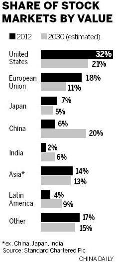 That share will put China just behind the United States, which is forecast to account for 21 percent of the world's total equity market value.