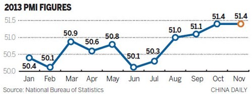 The National Bureau of Statistics released the November manufacturing Purchasing Managers' Index of 51.4, unchanged from October and besting market expectations of 51.1.