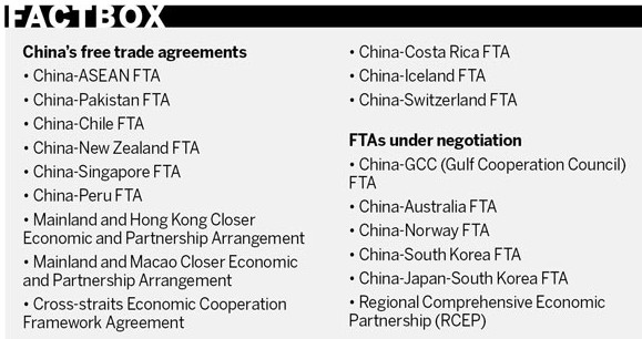 China has signed FTAs with 12 countries and organizations, including the Association of Southeast Asian Nations, Iceland and Switzerland, and is under negotiations with six economies, including South Korea, the Gulf Cooperation Council and Australia, according to the ministry.