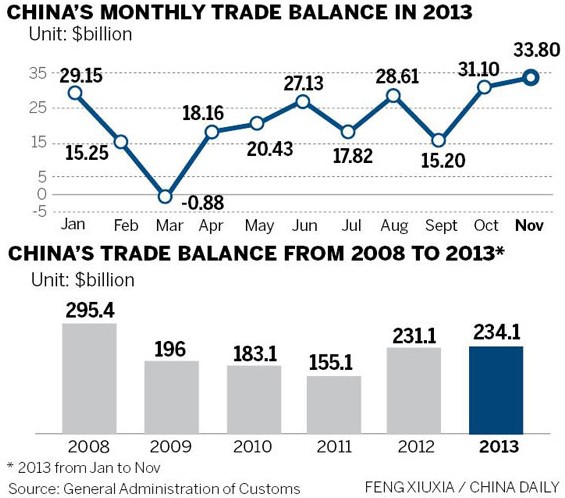 "November's remarkable trade surplus will increase expectations for the appreciation of the renminbi. It will also weaken China's exports next year when the US tapers off its monetary stimulus and capital flows out of China," Wang said.