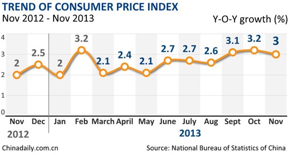 China's consumer price index (CPI), a main gauge of inflation, grew 3 percent year on year in November, down from 3.2 percent in October, the National Bureau of Statistics (NBS) said on Monday.