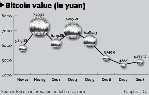 After the PBC announced the notice, the intraday value of Bitcoin plummeted from 6,280 yuan ($1032.43) Thursday to about 4,669 yuan on Saturday, then increased to 4,888 yuan Sunday by press time, according to btc123.com, a Chinese Bitcoin trading platform.
