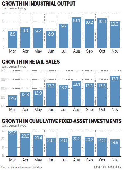 The output from industrial enterprises with annual sales of more than 20 million yuan ($3.29 million) rose 10 percent from a year earlier, a fall from October's 10.3 percent year-on-year growth, according to data released by the National Bureau of Statistics on Tuesday.
