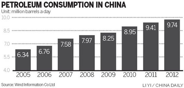 The report said that China's petroleum consumption will reach 10 million barrels a day this year, up 405,000 barrels a day from last year.