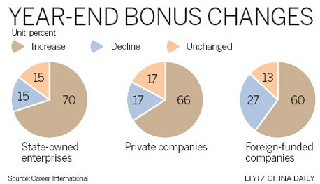 About 70 percent of SOEs will see their bonus level rise compared with last year, as opposed to 66 percent of private companies and 60 percent of foreign businesses, according to a survey conducted by leading staffing firm Career International.