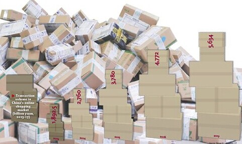 China's online shopping market has boomed in the recent five years thanks to the development of the country's Internet network and cheap express delivery services. According to Beijing-based iResearch Consultancy, the transaction volume in China's online shopping market is expected to reach 2.76 trillion yuan ($449.24 billion) in 2014, which will more than double to hit 5.63 trillion yuan in 2017.