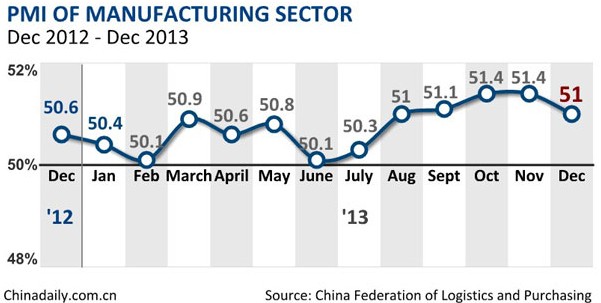 Zhao Qinghe, an economist from the NBS, said that weaker momentum indicated by December's PMI is because of the seasonal factors. "The PMI figure still shows expansion in December, and it has remained above 50 for 15 consecutive months, which means the general industrial situation is stable," said Zhao.