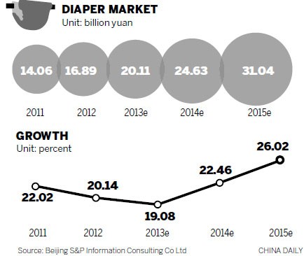 The company said China's baby disposable diaper market generated revenue of 20.11 billion yuan ($3.28 billion) in 2013, up 19 percent year-on-year.