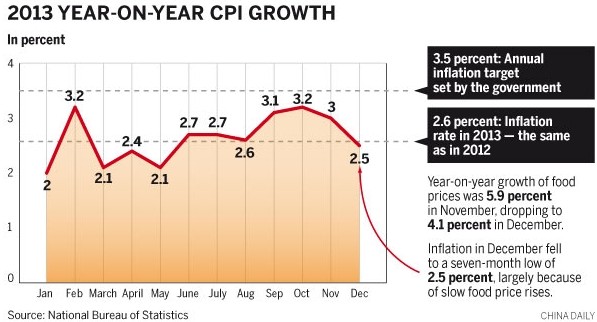 China CPI rises 2.6 pct in 2013