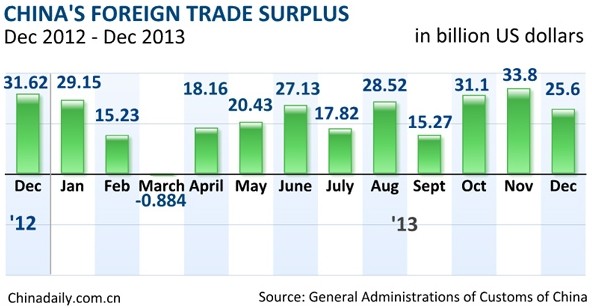 China‘s 2013 exports rise 7.9 pct, imports up 7.3 pct