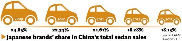 Despite the strong growth in sales of Japanese sedans in China during the past few months, their share of the domestic market saw a further decline to 18.13 percent in 2013, down from 18.28 percent in 2012, according to statistics released Thursday by the China Association of Automobile Manufacturers (CAAM).