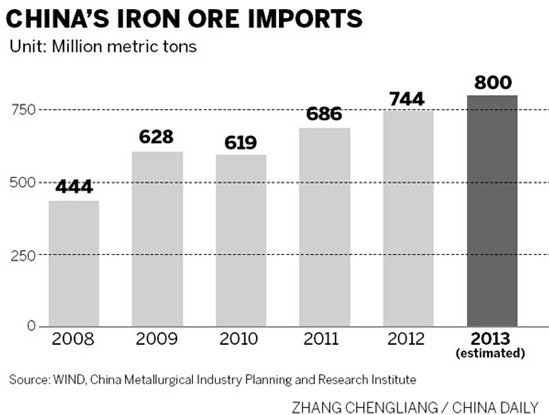 He estimated 2013's iron ore imports will total 800 million metric tons, up 7.5 percent, accounting for about 70 percent of the country's iron ore demand.