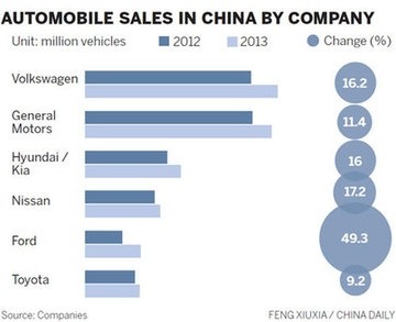 Japan-based Nissan Motor Co took fourth position. It said sales in China reached 1.27 million units, a 17.2 percent year-on-year improvement from 2012.
