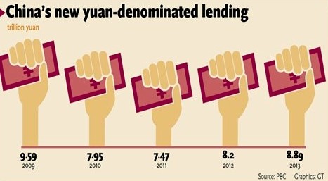 In 2013, total yuan-denominated lending topped 71.9 trillion yuan, up 14.1 percent compared with 2012, the PBC said.