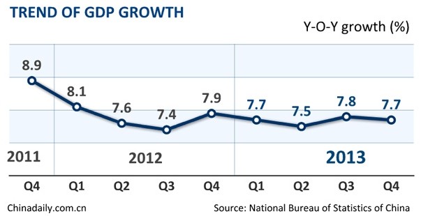 Niu Li, an expert with the State Information Center, a think tank under the National Development and Reform Commission, forecast the growth rate would slip back to 7.5 percent in 2014 because of domestic challenges such as overcapacity, fiscal risks and rising property prices.