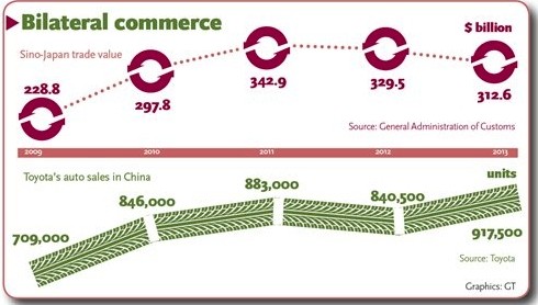 The trade value between China and Japan hit $312.6 billion in 2013, down 5.1 percent from a year earlier, -according to MOC.