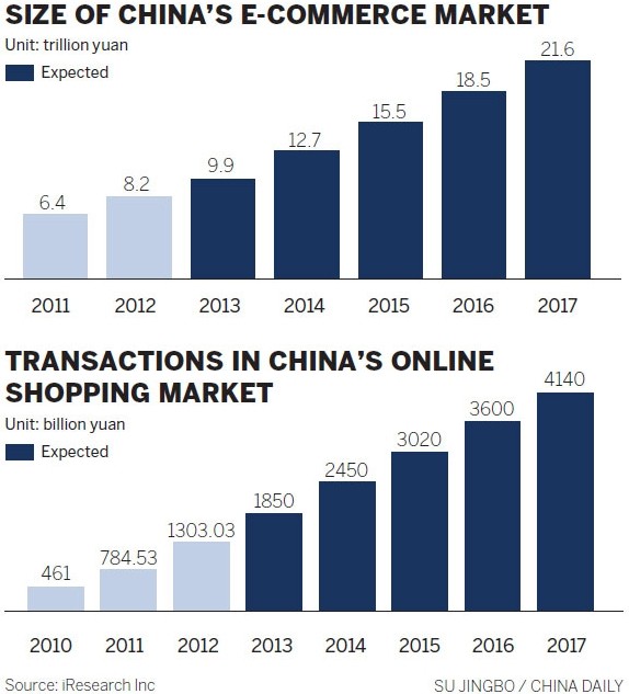 China's e-commerce market grew at an average rate of 71 percent from 2009 to 2012, said a report from global management consulting firm Bain & Co. But chain retailers have had a tougher time over the past several years.
