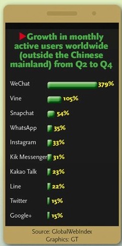 Data from UK market research firm GlobalWebIndex in early January showed that in the fourth quarter of 2013, 78 million mobile devices users worldwide (excluding the Chinese mainland) used WeChat per month, up 379 percent from the second quarter.