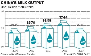 According to the National Bureau of Statistics, the country encountered a notable drop in raw milk production last year, with output totaling 35.31 million tons in 2013, a 5.7 percent decrease from the previous year. That move led to a price rise in dairy products and battles among major firms for the supply of raw milk in the domestic market.