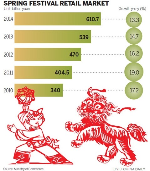 Data from the ministry showed sales of China's retailers and catering businesses went up 13.3 percent from a year earlier to 610.7 billion yuan ($100.7 billion). during the week-long holiday which lasted from Jan 31 to Feb 6 this year. Gatherings and reunions during the break usually boost spending.