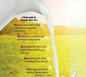In June 2013, Mengniu acquired Guangdong-based Yashili International Holdings Ltd with 9.73 billion yuan ($1.61 billion) as part of a plan to expand its milk powder business.