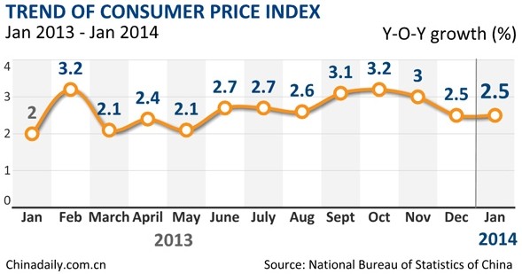 China's consumer price index (CPI), a main gauge of inflation, rose 2.5 percent year on year in January, the same as the previous month, official data revealed on Friday.