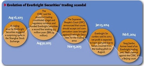 "It didn't matter that Everbright told the regulators that its system made an error, because it is responsible to the investors, not the officials," Zhang said. "If the company did not inform investors of the mistake via a formal statement, it should be considered as having withheld information."