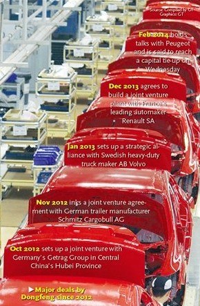 Moreover, Dongfeng has had a joint venture with PSA since 1992 and established another joint venture with French carmaker Renault SA last year, so the investment in PSA will give Dongfeng more say in the joint venture of PSA and further strengthen its advantage in manufacturing and selling French-style cars in China, according to Feng.