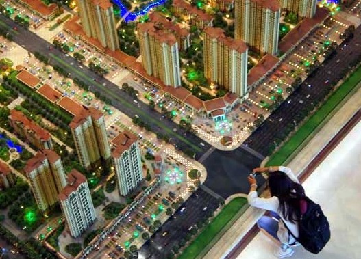 A potential homebuyer takes a photo of a property display model in Beijing. [File photo / China Daily]