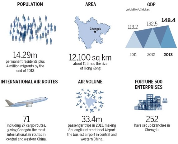 Backed by the country's drive to develop western China and Premier Li Keqiang's call for a new round of opening-up, Chengdu's aim is to become the growth engine of the western region and a city with global appeal, said Huang Xinchu, Party chief of Chengdu.