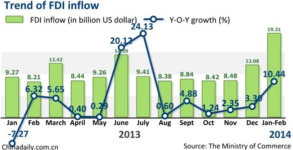 With an inflow of 15.3 billion U.S. dollars, the affluent east of China continued to grab the lion's share of FDI in January and February.