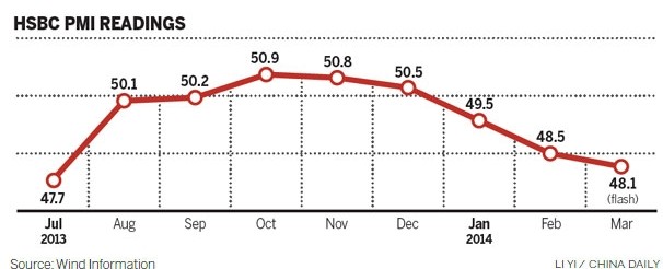 The HSBC China flash manufacturing PMI fell to an eight-month low in March, deepening concern that the Chinese economy might not meet its 7.5 percent growth target in 2014.