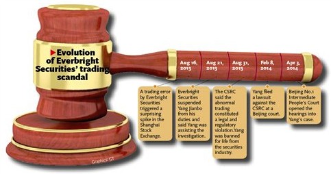 Representatives of the CSRC said at the court hearing Thursday that the decision on insider trading was based on the law and regulations, adding that Everbright had misled investors by failing to make the trading error public information straight away.