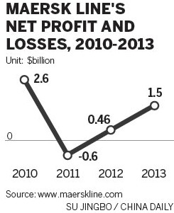 Despite being challenged by a still weak global shipping market, Maersk Line achieved a profit of $1.5 billion from the world market in 2013, up from $461 million a year earlier, thanks to vessel network efficiencies and lower bunker prices.