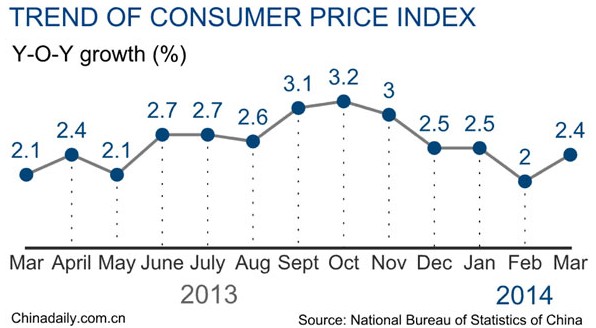 China's consumer price index (CPI), a main gauge of inflation, increased 2.4 percent year on year in March, up from 2 percent in the previous month, official data showed on Friday.