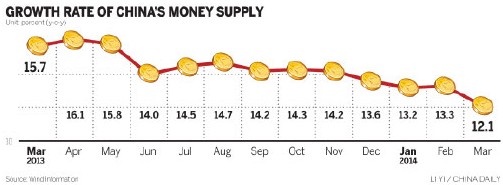The central bank said that the expansion of M2, a broad measure of money supply, slowed to 12.1 percent year-on-year from 13.3 percent in February. The market consensus was for an increase of 13 percent.