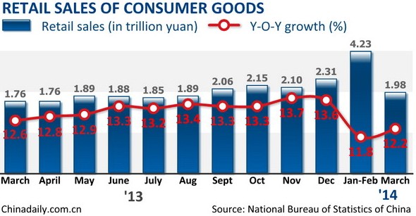 In March, retail sales gained 12.2 percent from the same period last year to 1.98 trillion yuan and deducting inflation, the actual growth rate was 10.8 percent, said the NBS.