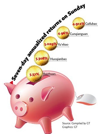 Cunqianguan, an online monetary fund launched on April 22 by Internet firm Sina Inc, also saw its annualized return drop to 4.96 percent on Sunday.